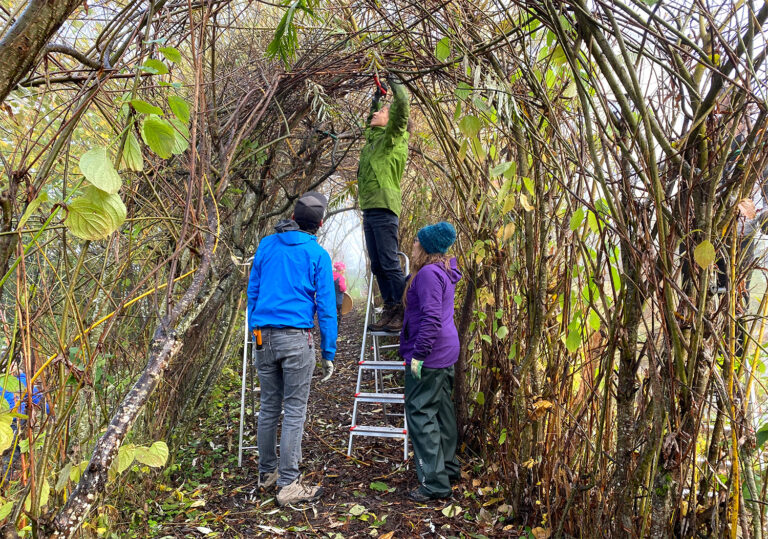 Unser Naturspielplatz wird gepflegt! Beim Gartenarbeitsmorgen schneiden wir Weidentunnel, Pavillon und Hecken zurück und bringen sie in Form.