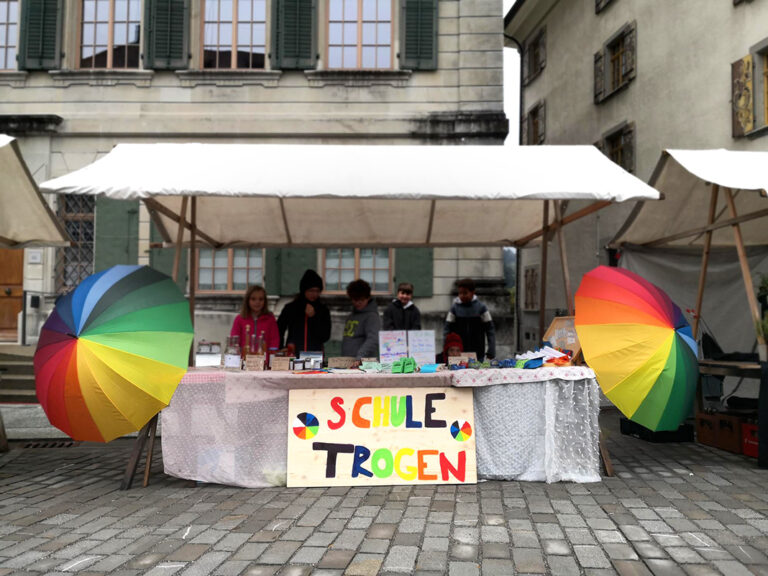 Kinder der Mittelstufe verkaufen ihre selbst gemachten Arbeiten aus den Ateliernachmittagen: Kräutersalz, Samenbomben, Tonschälchen.